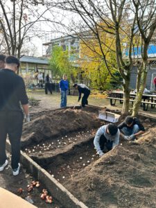 Nachdem die Fläche nun vorbereitet war, haben die Schülerinnen und Schüler 750 Tulpenzwiebeln gesetzt.